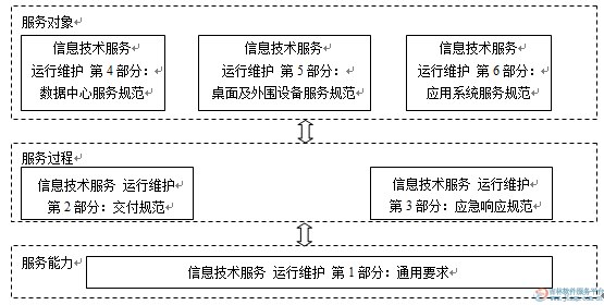随着各行业、各领域信息化工作的深入开展,越来越多的信息系统进入运行维护阶段。然而,提供运行维护服务的各类组织的能力水平参差不齐,需方缺乏评价或选择供方的方法、手段及规范。本标准对不同服务对象、服务过程和服务需求的能力要素进行抽象,并通过关键指标对服务能力进行评价;同时针对运行维护服务过程、服务交付内容及特定服务需求的要求;另外还针对不同服务对象的运行维护服务提出了要求。各部分之间的关系如图1所示。