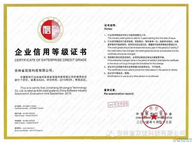 2015年10月23日,吉林省双佳科技有限公司成功获得企业信用评价“AAA”级信用等级荣誉称号。这是国家权威信用评定的最高等级!