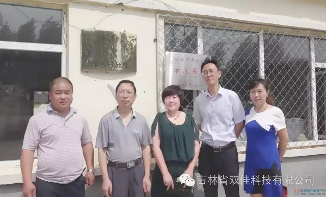 双佳科技总经理朱琳、长春市朝阳区商务局局长王金哲、杨木村领导合影