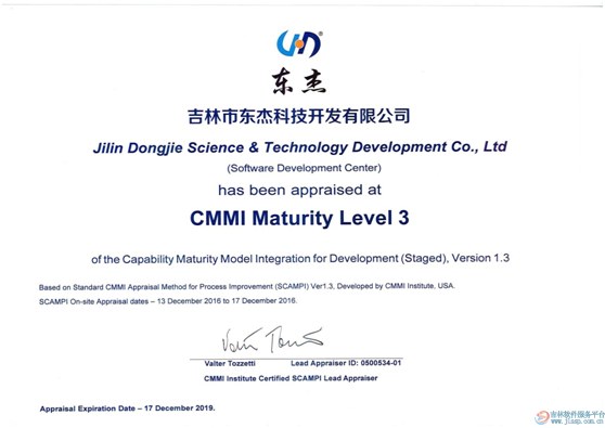 2016年12月16日上午,吉林市东杰科技开发有限公司 举办CMMI最终评审结果发布会,由CMMI主任评估师Valter宣布:“通过严格审核和评估,吉林市东杰科技开发有限公司已达到CMMI三级标准,成功通过CMMI三级评估!”。