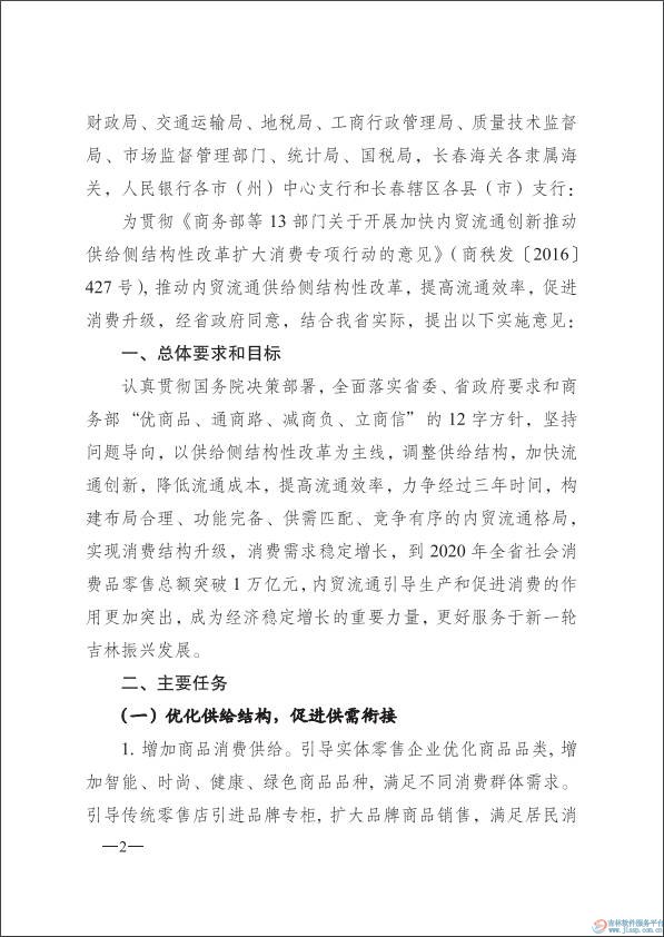 《意见》提出的总体要求和目标是:认真贯彻国务院部署,全面落实省委、省政府要求和商务部“优商品、通商路、减商负、立商信”的12字方针,坚持问题导向,以供给侧结构性改革为主线,调整供给结构,加快流通创新,降低流通成本,提高流通效率,力争经过三年时间,构建布局合理、功能完备、供需匹配、竞争有序的内贸流通格局,实现消费结构升级,消费需求稳定增长,到2020年全省社会消费品零售总额突破1万亿元,内贸流通引导生产和促进消费的作用更加突出,成为经济稳定增长的重要力量,更好服务于新一轮吉林经济振兴。《意见》部署了优化供给结构,促进供需衔接、加快流通创新,引导消费升级、加强基础服务,降低流通成本、改善消费环境,保障安全消费四个方面的主要任务。其中,在加快流通创新,引导消费升级方面,重点对发展电子商务作出安排,要求加快推进电子商务进社区,鼓励“双佳科技”等电商企业,统筹餐饮、住宿、家政等居民生活服务业,搭建互联网社区生活服务综合平台,打通电子商务、社区网点和配送平台信息链,提供现场体验、线上下单、便捷支付、配送到家等“一站式”服务。