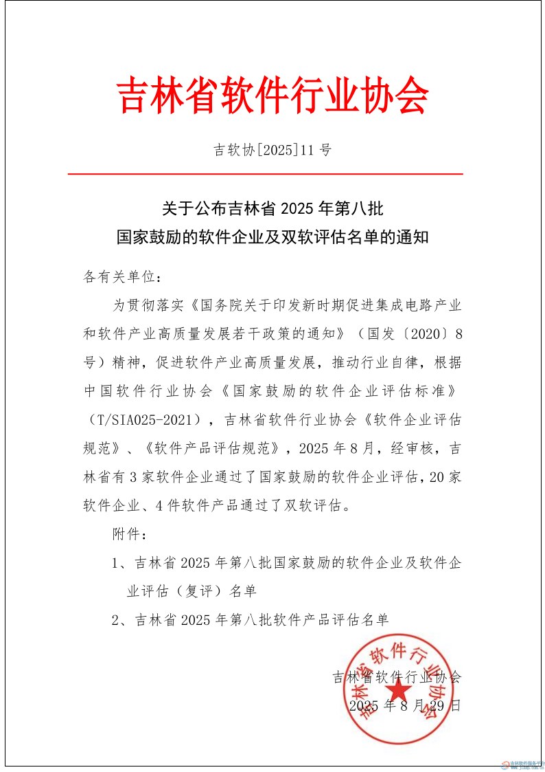 关于公布吉林省2025年第八批国家鼓励的软件企业及双软评估名单的通知