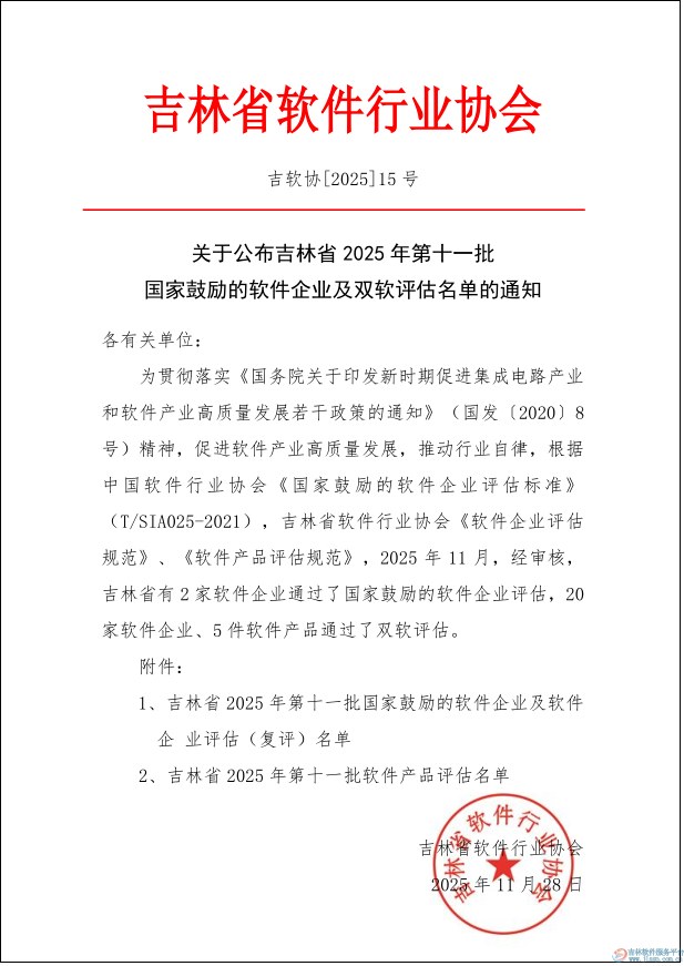 关于公布吉林省2025年第十一批国家鼓励的软件企业及双软评估名单的通知
